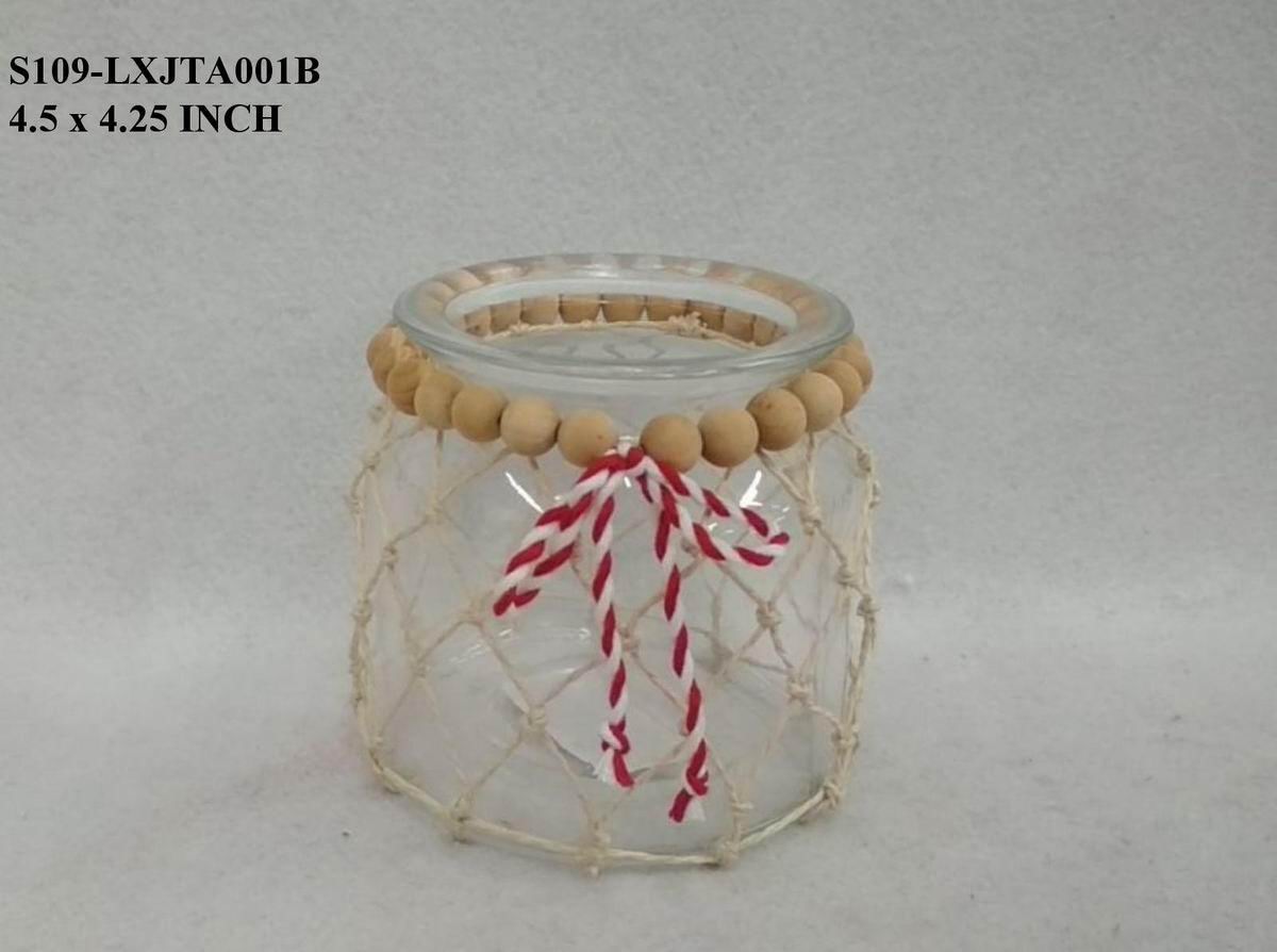 4.5x4.25x0.0 This Glass Jar is thoughtfully detailed with natural wood beads and string bows, combining rustic charm with minimalist elegance. Its clear structure highlights the handcrafted embellishments, making it an ideal piece for stylish storage or decorative accents that add warmth and texture to any interior setting.