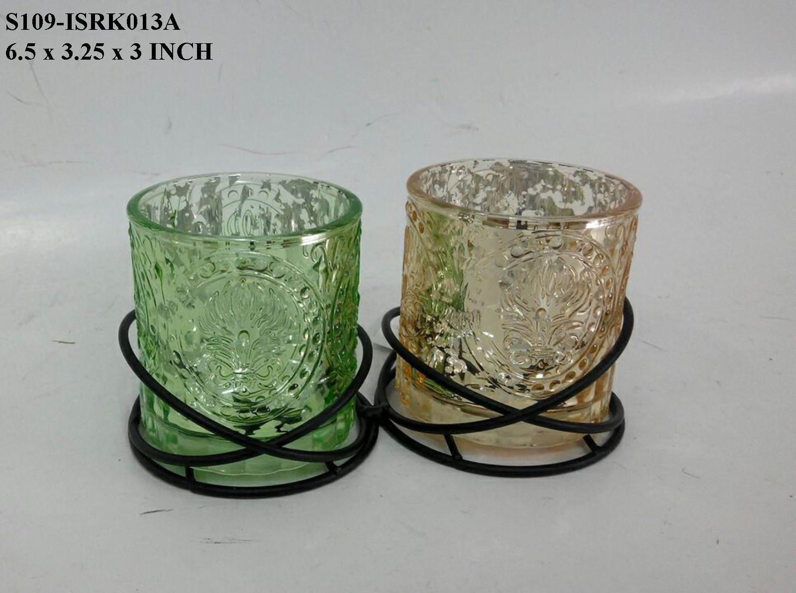 4.0x4.5x0.0 This glass and wired candle holder is expertly designed to combine the clarity of heat-resistant glass with the structural support of a durable wire frame. Providing a stable and secure base, it enhances candlelight diffusion while offering a contemporary, industrial aesthetic. Ideal for adding both safety and refined style to any interior setting.