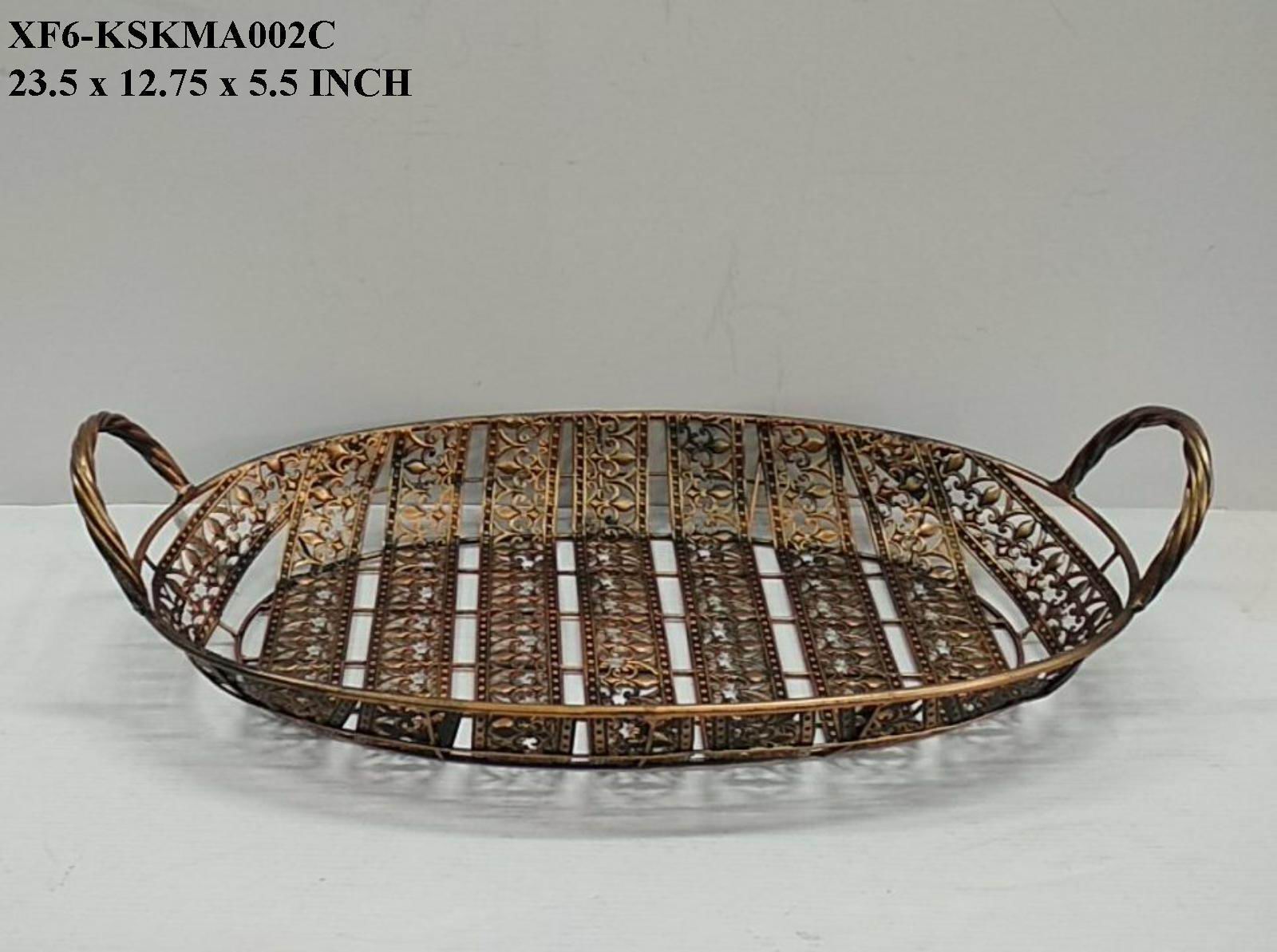 23.5x12.75x5.5 This brown metal tray with handle is expertly crafted from high-quality metal featuring a warm, matte finish. Its sturdy construction provides reliable support for serving or display, while the integrated handle ensures easy and secure transport. Combining durability with refined design, it complements various interior styles with practical elegance.