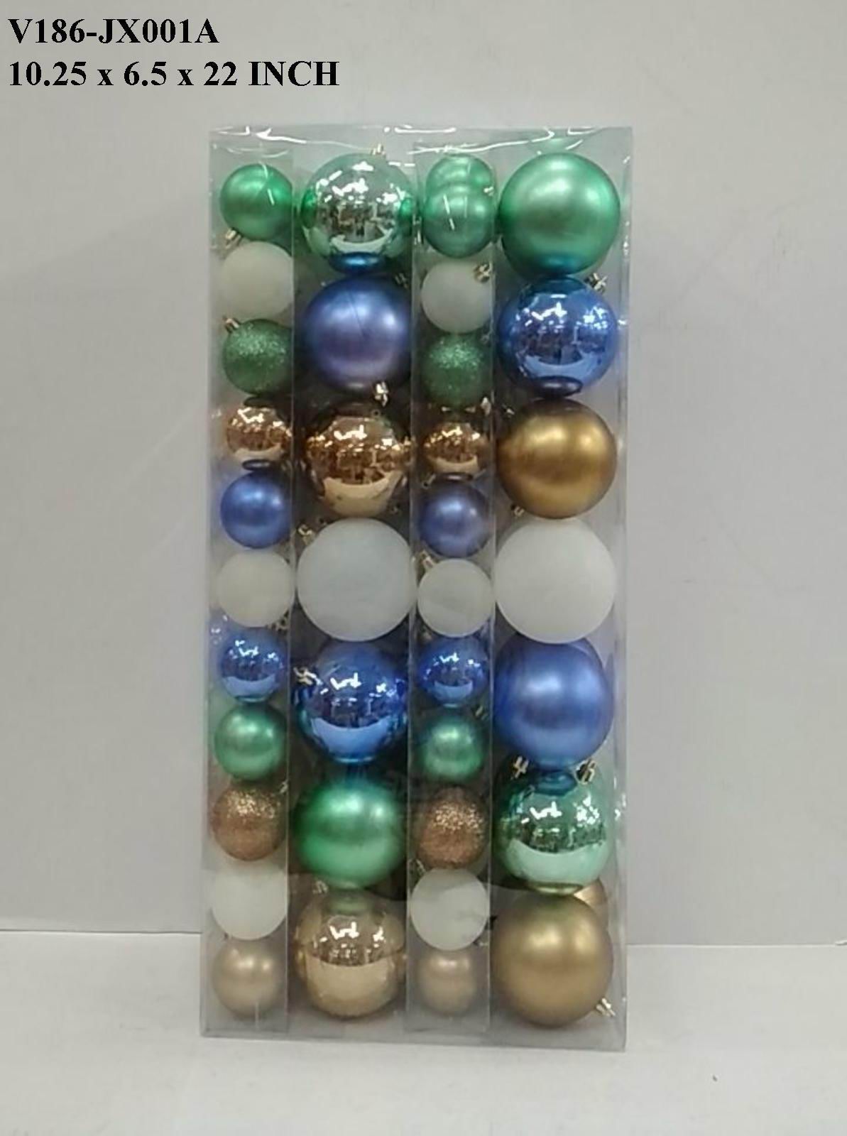 10.25x6.5x22.0 This boxed set of multicolor shatterproof balls offers vibrant, durable decoration for holiday or event settings. Crafted to withstand impact, these ornaments combine safety with festive appeal, providing a reliable and colorful enhancement to your decor without the fragility of traditional glass.