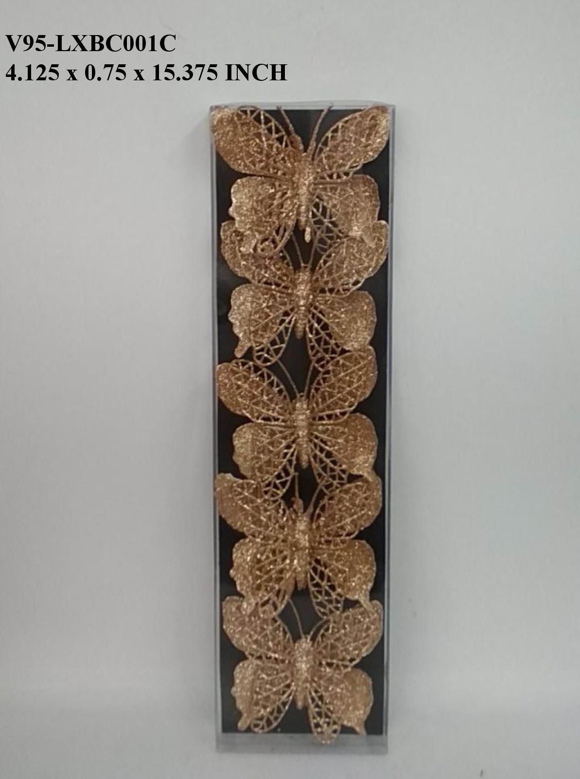4.125x0.75x15.375 This boxed set of gold butterfly clip ornaments offers a delicate yet durable addition to your holiday decor. Crafted for easy attachment, each clip ornament provides versatile placement options, enhancing wreaths, centerpieces, or trees with refined elegance. The gold finish adds a warm, sophisticated touch, blending seamlessly with various festive themes while ensuring lasting beauty throughout the season.