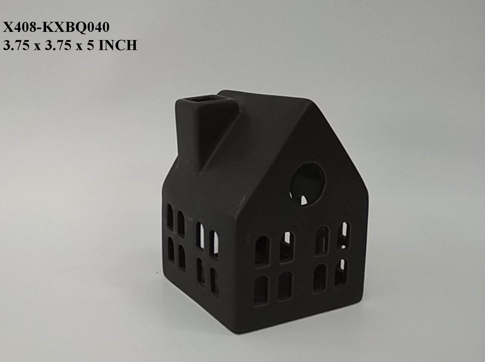 3.75x3.75x5.0 Handcrafted ceramic tea light holder featuring a charming house silhouette in deep black glaze. This decorative piece combines functionality with artistic appeal, perfect for creating ambient lighting in any room. Simply place a tea light candle inside to cast a warm, inviting glow through the house-shaped cutouts.?
