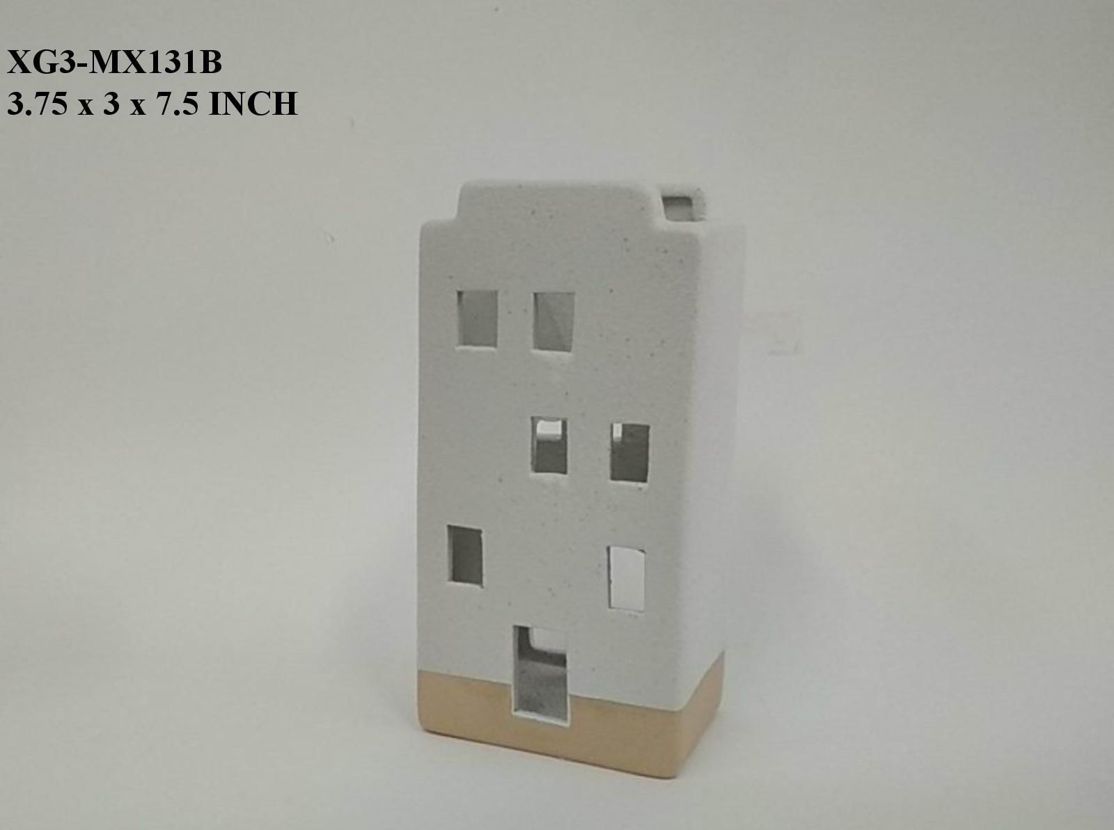 3.75x3.0x7.5 This ceramic lighted house is crafted with precision from high-quality ceramic, combining durability with refined design. Its smooth finish and integrated soft lighting provide a warm, inviting glow, making it an ideal decorative accent for tabletops, shelves, or mantels. Designed to enhance various interior styles, it offers both functional illumination and sophisticated aesthetic appeal.