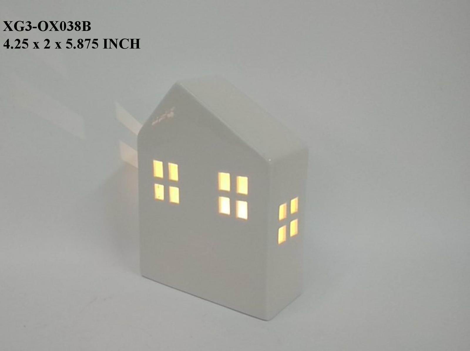 4.25x2.0x5.875 This ceramic lighted house is crafted with precision from high-quality ceramic, combining durability with refined design. Its smooth finish and integrated soft lighting provide a warm, inviting glow, making it an ideal decorative accent for tabletops, shelves, or mantels. Designed to enhance various interior styles, it offers both functional illumination and sophisticated aesthetic appeal.