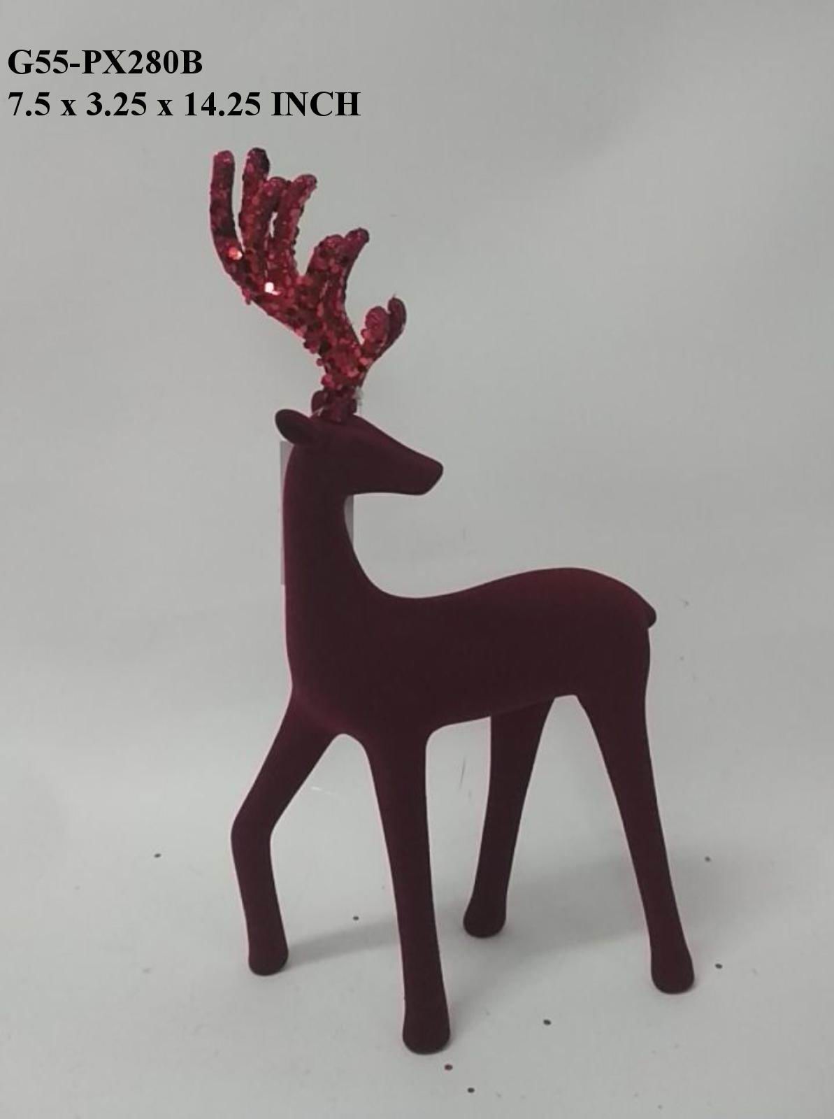 7.5x3.25x14.25 The Burgundy Flocked Standing Reindeer offers a refined holiday accent with its rich burgundy hue and soft flocked texture. Expertly crafted for durability and detail, this standing reindeer adds sophisticated seasonal charm to upscale and professional settings. Its compact size makes it versatile for tabletop displays or decorative arrangements.