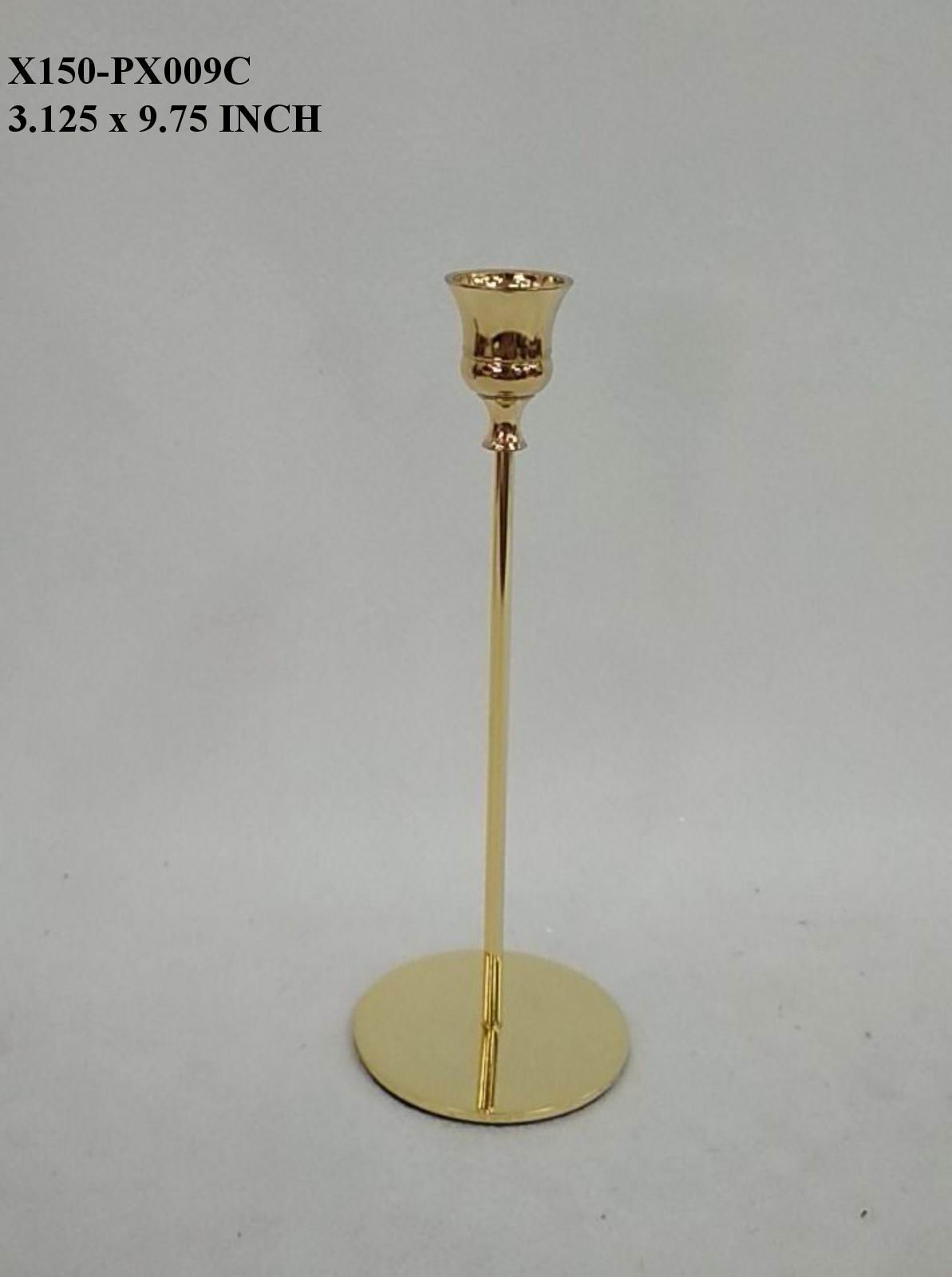 3.125x9.75 This gold candle holder features expert craftsmanship with a polished metallic finish. Its compact yet sturdy design ensures secure support for candles, making it an elegant addition to tabletops, mantels, or decorative arrangements. Perfect for adding a subtle touch of warmth and sophistication to any setting.