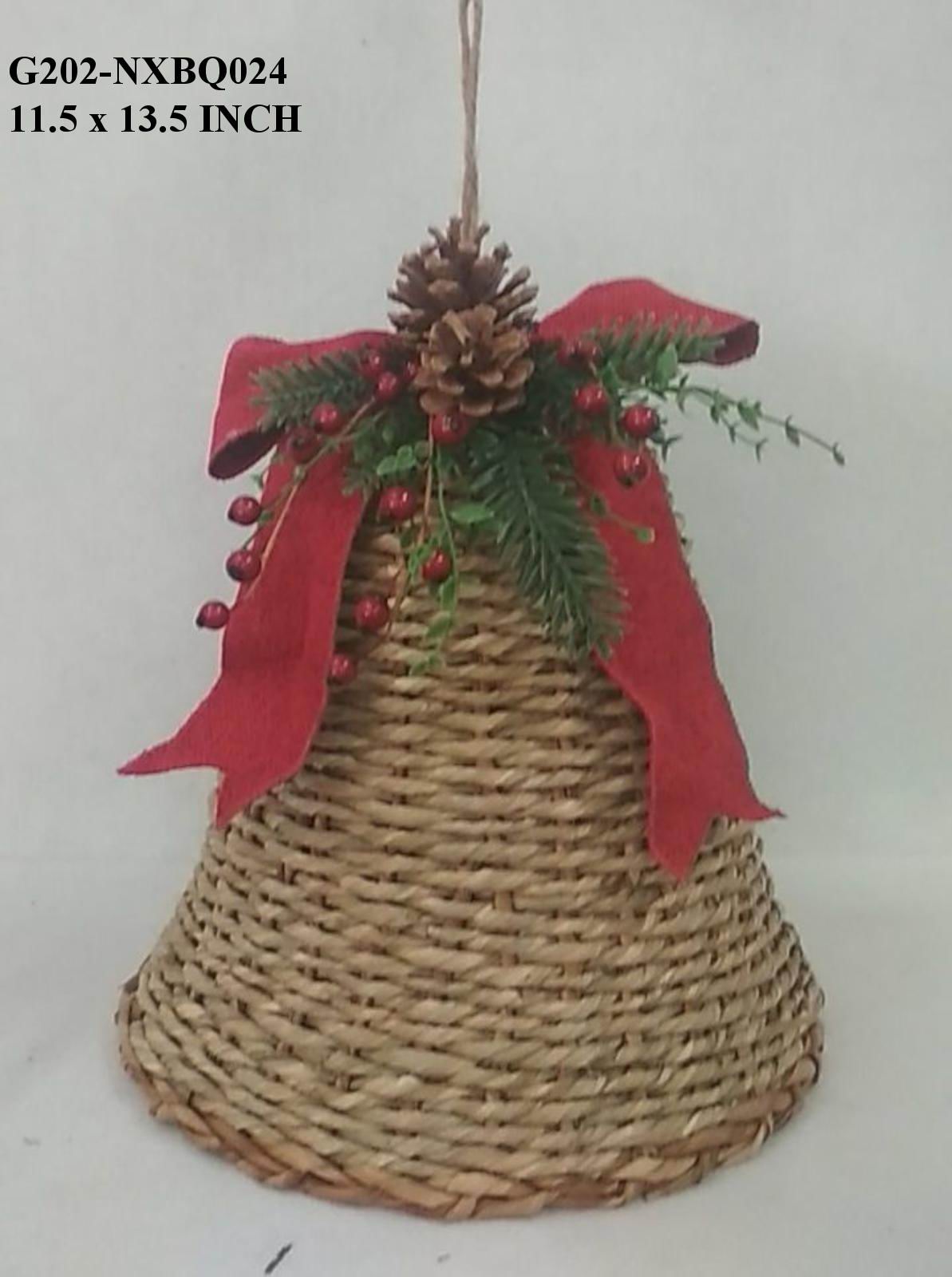 11.5x13.5 This 13-inch natural weave bell with a red bow combines traditional craftsmanship with festive elegance. Its intricate woven texture adds a warm, rustic charm, while the vibrant red bow provides a striking contrast. Designed as a versatile holiday accent, it enhances seasonal decor with both natural beauty and refined detail.