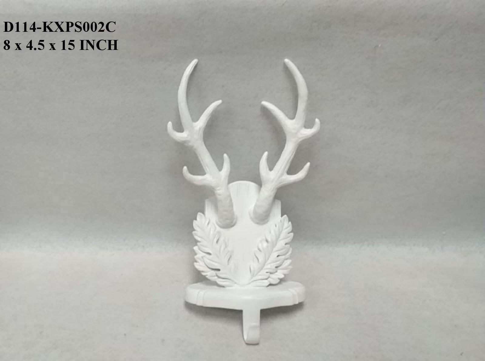 8.0x4.5x15.0 Enhance your holiday mantel with the Polyresin White Deer Antler Stocking Holder, expertly crafted to combine durability with elegant design. Made from high-quality polyresin, it features a realistic white antler motif that provides secure support for your stockings while adding a sophisticated, nature-inspired accent to your seasonal decor. This holder balances functionality and style, making it an essential piece for refined festive arrangements.