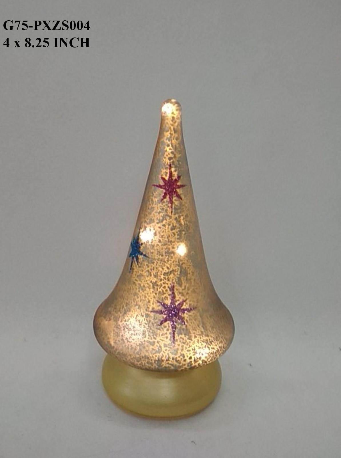 Illuminate your space with this golden glass lighted cone tree, a stunning decorative accent adorned with vibrant multicolored stars throughout. Standing 8.25 inches tall with a 4.0-inch diameter base, this striking piece brings festive brilliance to shelves, tables, and seasonal displays. The integrated lighting combined with the star embellishments creates a mesmerizing glow that captures attention and spreads holiday cheer. Crafted from quality glass, this sculptural tree merges contemporary design with traditional festive appeal. Perfect for those seeking to introduce layered illumination, artistic detail, and celebratory warmth into their home with a statement-making accent that delights year-round.