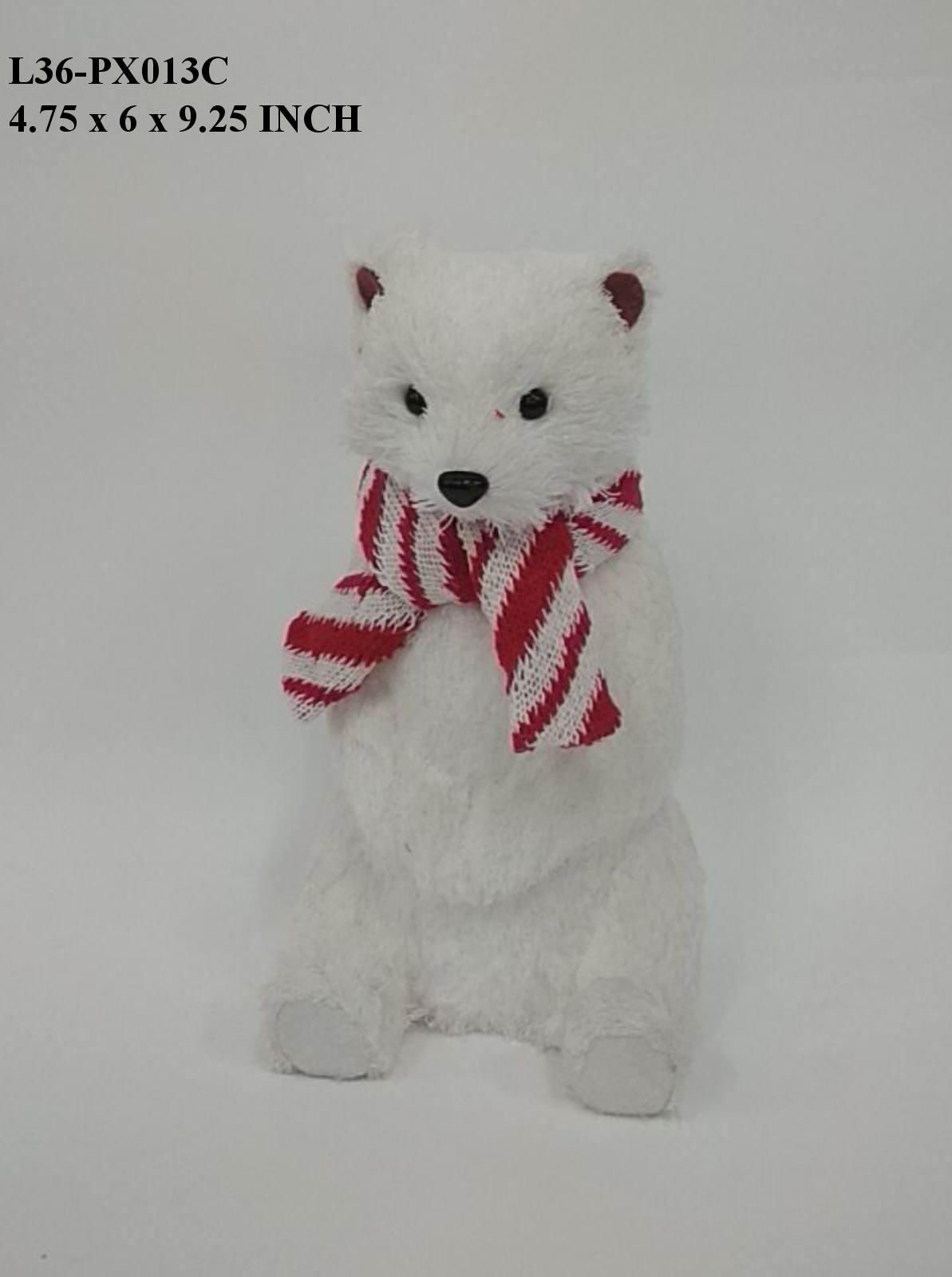 4.75x6.0x9.25 This charming sitting bear features a pristine white finish accented by a festive red and white scarf, combining timeless elegance with seasonal appeal. The striped scarf detail introduces vibrant character while maintaining sophisticated restraint. Constructed from lightweight styrofoam, it offers both durability and ease of display across various settings.?