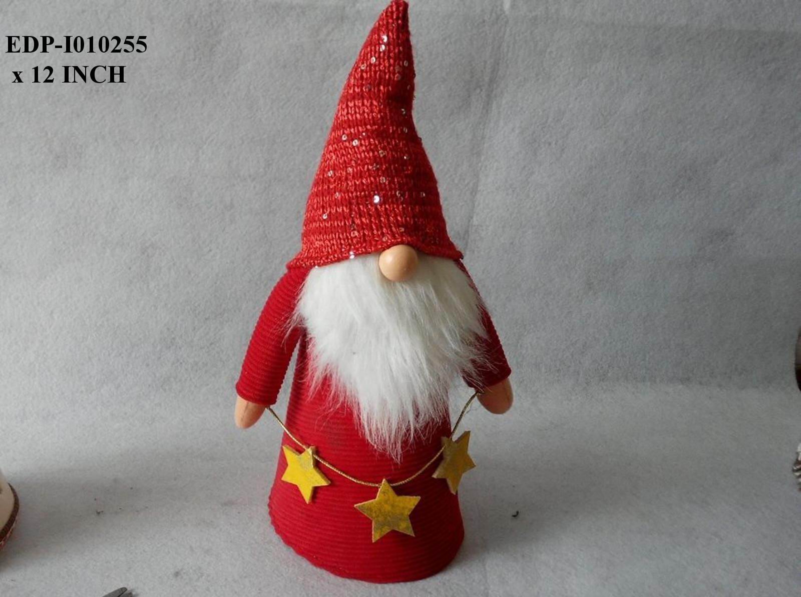 12.0" This red fabric standing gnome holding stars exemplifies expert craftsmanship, combining soft textile materials with detailed design. The vibrant red fabric contrasts elegantly with the shining stars, creating a charming and festive accent. Its sturdy construction ensures durability, making it a versatile decorative piece that adds warmth and whimsy to seasonal or year-round displays.