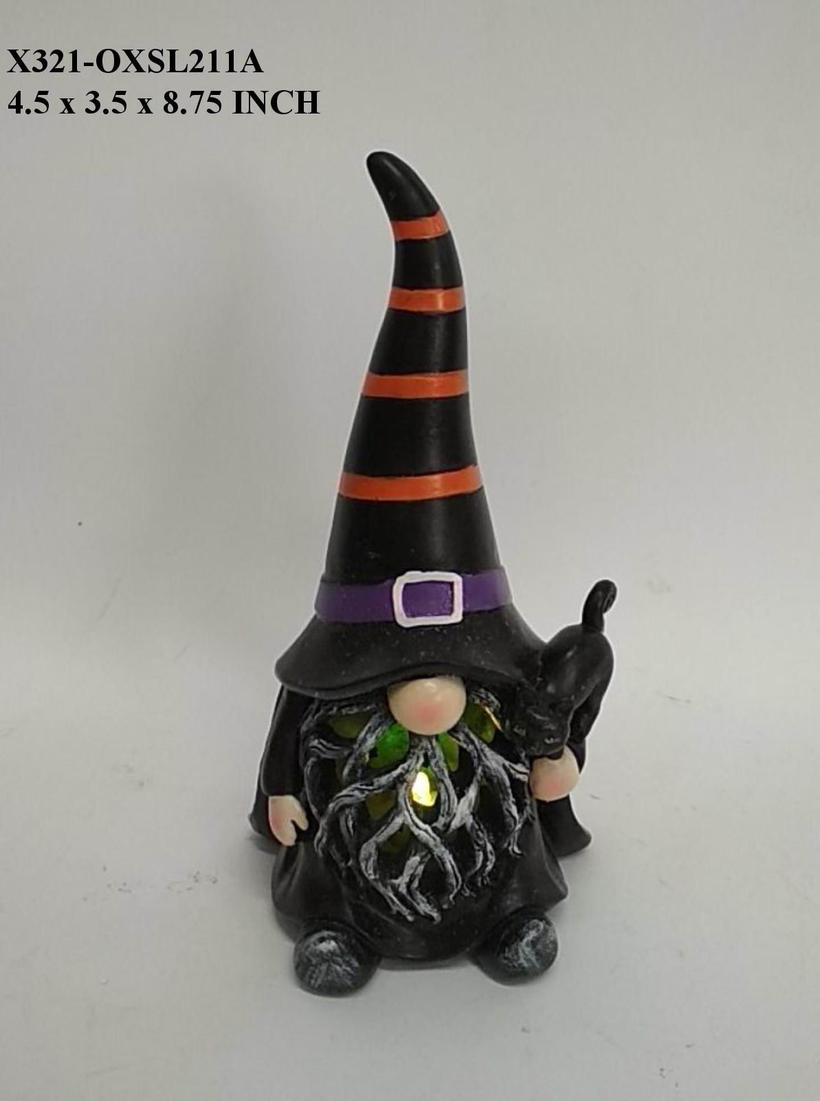 4.5x3.5x8.75 Ceramic Halloween Gnome with Cat This whimsical Halloween composition features a ceramic gnome accompanied by a black cat, expertly sculpted with festive seasonal character and playful detail. The pairing captures spooky tradition with charming authenticity, blending gnome folklore with classic Halloween imagery.