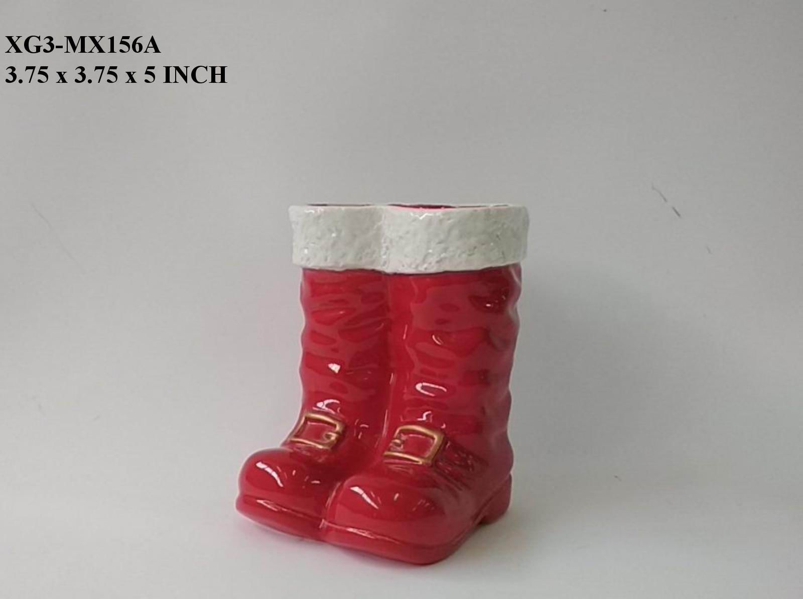 3.75x3.75x5.0 These ceramic Santa boots are expertly crafted to provide a festive and durable decorative accent. Featuring a smooth finish with detailed design, they capture the classic holiday spirit while offering lasting quality. Ideal for tabletop or mantel displays, they add a sophisticated seasonal touch that enhances your holiday decor with subtle charm.