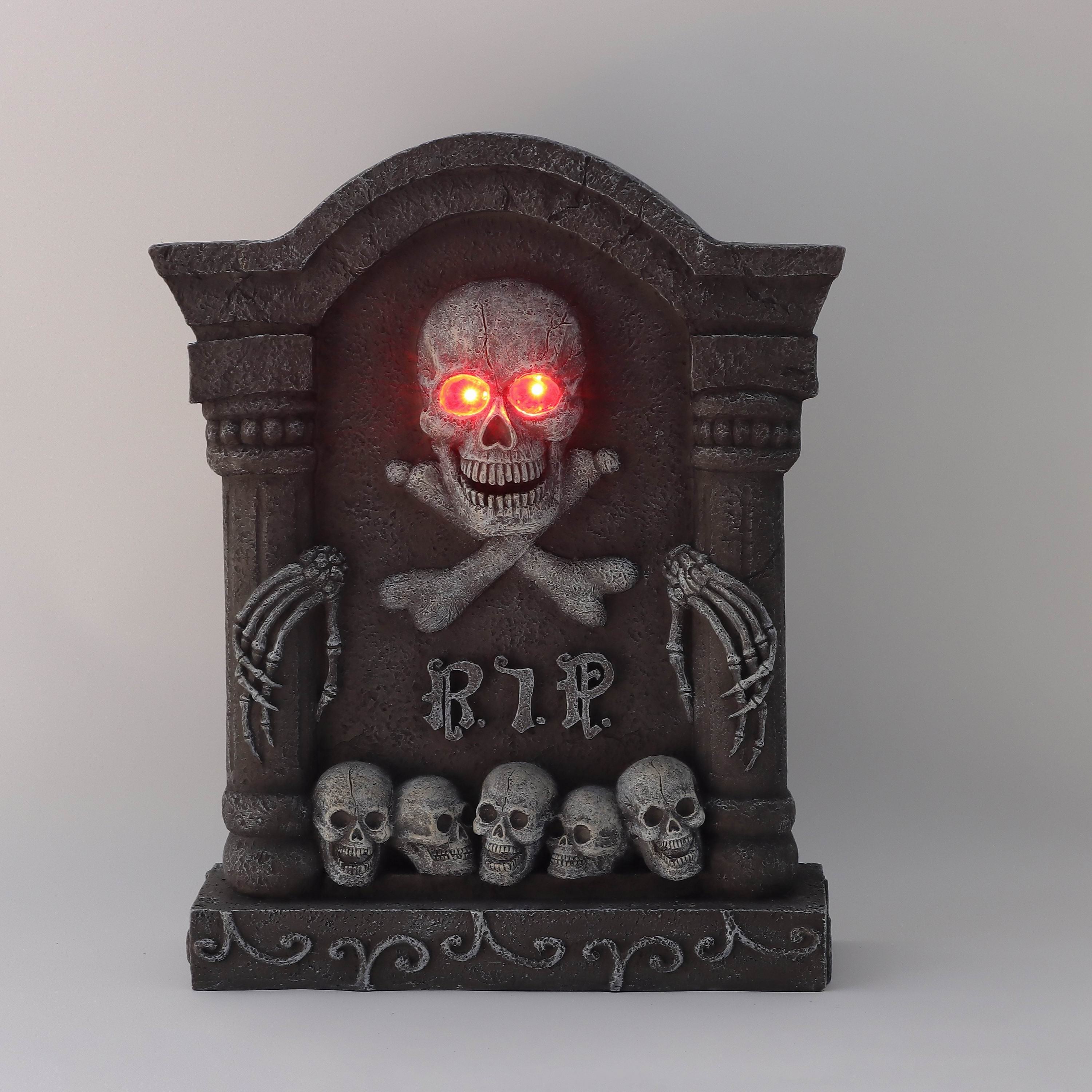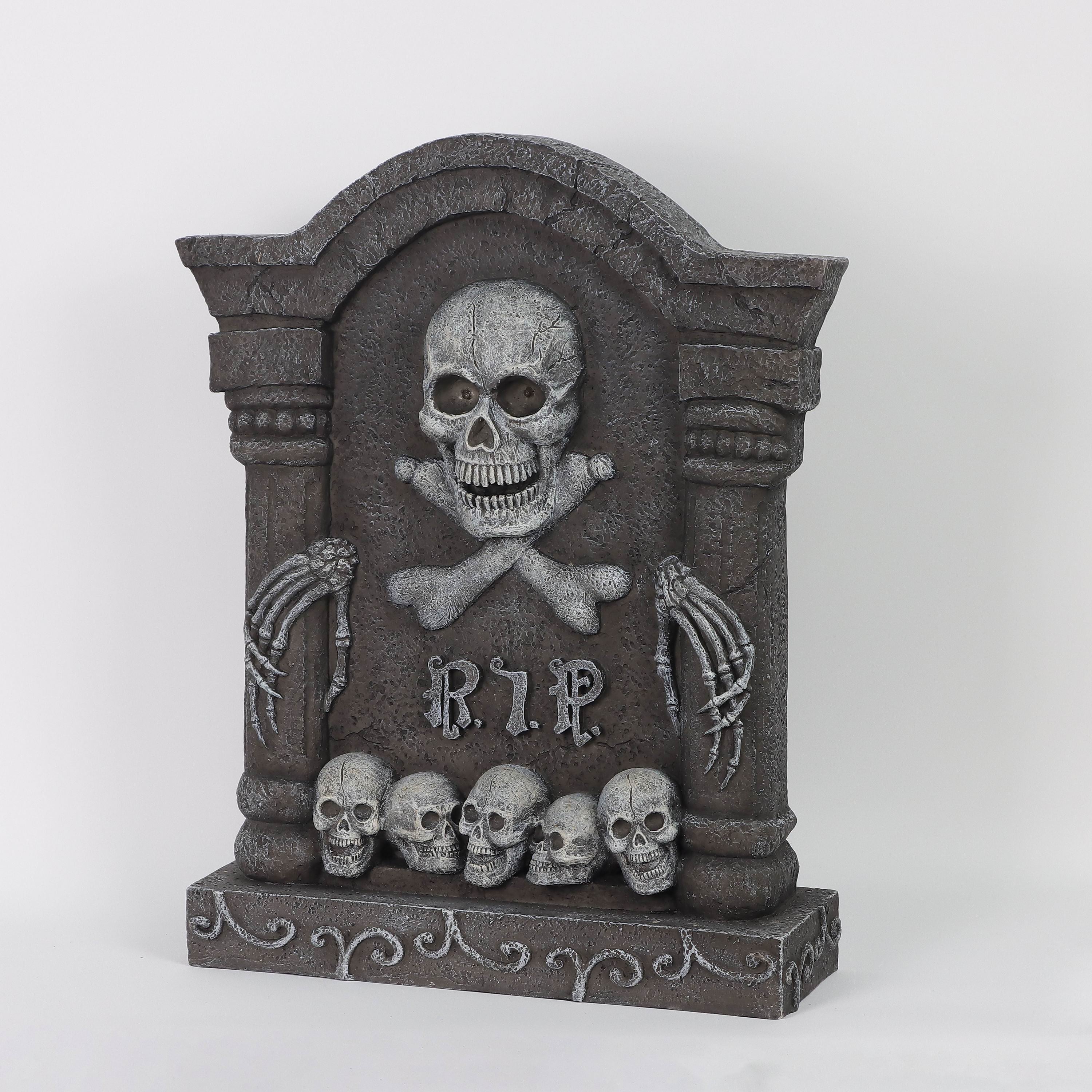 This 24-inch polyresin tombstone features intricately detailed skull accents, adding a bold and haunting presence to your Halloween decor. Crafted from durable polyresin, it exhibits realistic textures and expert artistry, making it ideal for enhancing both outdoor and indoor displays. Its substantial size and striking design provide a commanding focal point that elevates the atmosphere with sophisticated, spooky style.