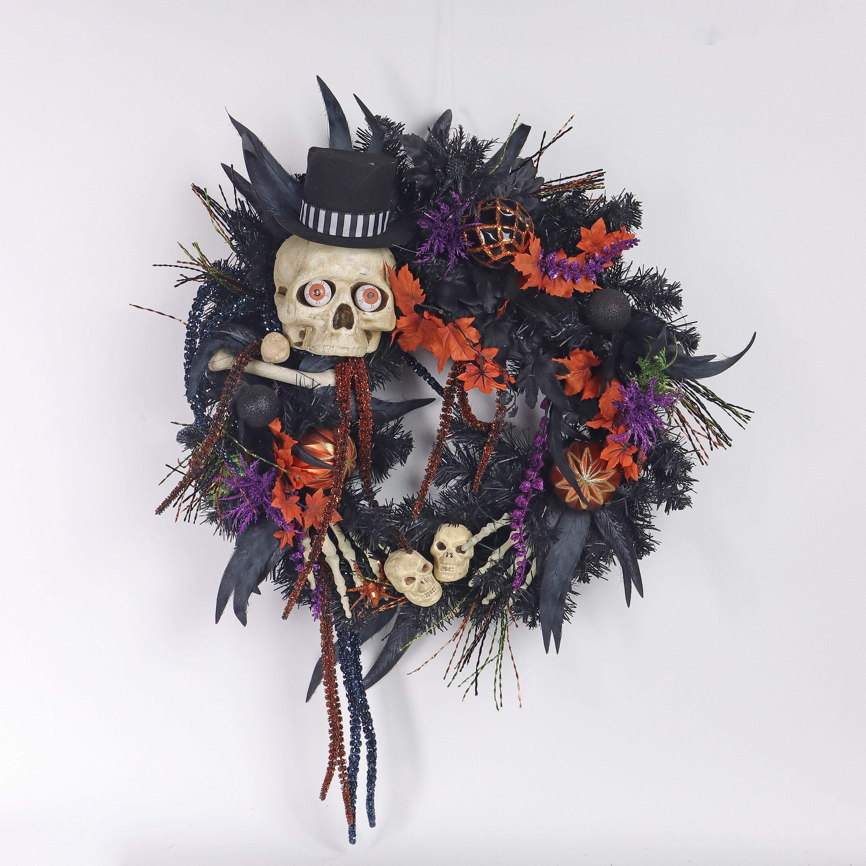 This 26" Halloween wreath expertly combines skulls, pumpkins, and skeleton motifs to create a bold and festive centerpiece. Crafted from durable materials, it offers lasting seasonal decor suitable for both indoor and outdoor display. Its large size and intricate design provide a striking focal point, adding a sophisticated yet spooky ambiance to your Halloween setting.