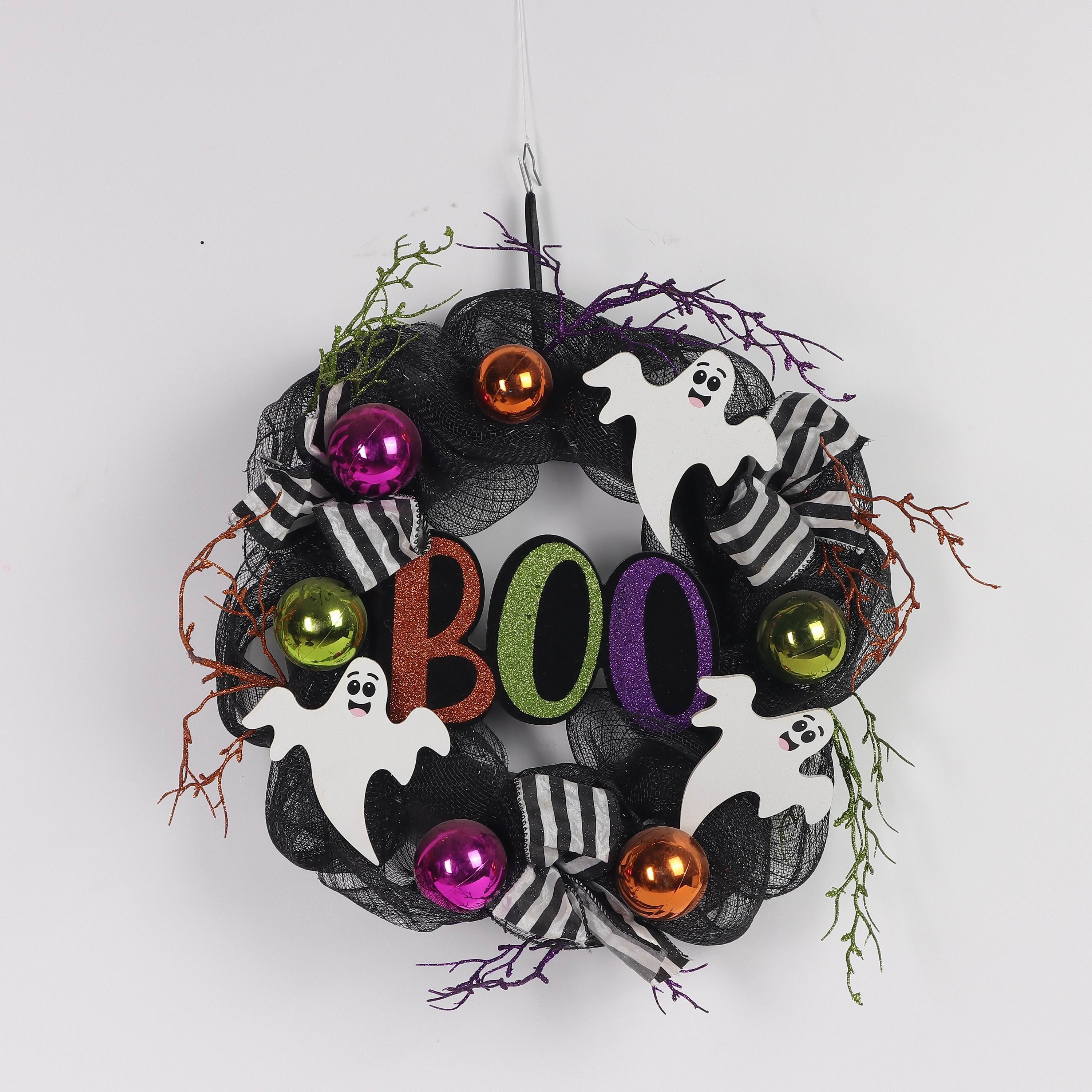 This 16-inch Halloween ghost wreath features meticulously crafted ghost elements, designed to add a subtle yet eerie accent to your seasonal decor. With detailed textures and balanced composition, it provides a sophisticated and haunting focal point perfect for doors or interior walls. Ideal for enhancing your Halloween ambiance with refined, expert craftsmanship.